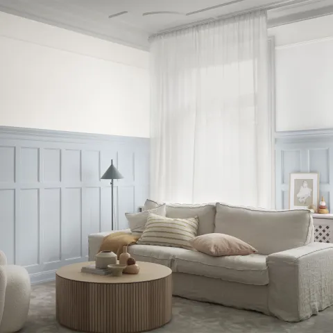 – En av mina favoritkombinationer från min färgkarta för Alcro är NEROLI i varmt beige och ILKE. Den ljusblå kulören ILKE har en perfekt smutsig ton som är direkt hämtad från den jag själv blandar i ateljén. Jag hade en vision om en himmel inomhus och nu känns det faktiskt meningsfullt att ligga i soffan och stirra upp i taket, avslutar Emilia Ilke.