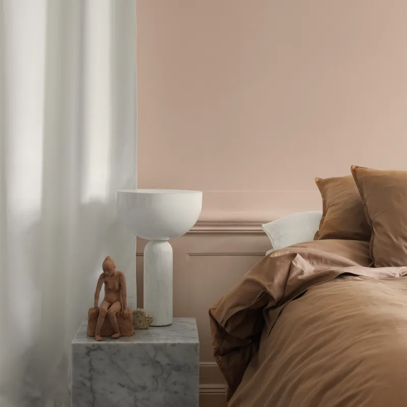 Den nedtonade och dova beigebruna kulören Nötcreme ger en avkopplande och lugnande atmosfär. Den har en svag intensitet som skapar en behaglig balans i ett rum. Passar bra med varmvita toner som till exempel Sockervadd eller Emilia White.