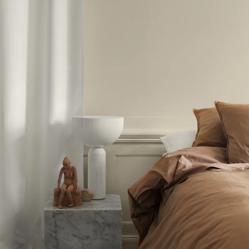 Mussla är en diskret gråbeige nyans som balanserar mellan neutralitet och subtil värme och ger en omslutande känsla. Den skapar en mjuk och harmonisk atmosfär och fungerar särskilt bra tillsammans med varma färgtoner.