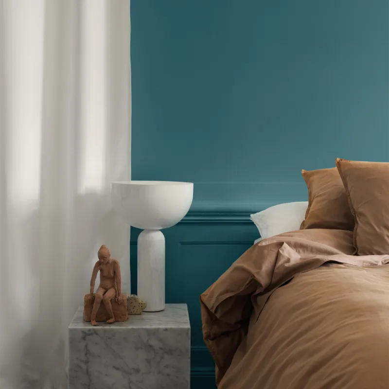Den mörka blågröna nyansen Klorofyll ger känslan av en stilla skymning, då grönskan i naturen blir blåtonad och mörk. Den balanserar perfekt mellan det kalla blåa och det lugna gröna och sprider en mystisk och lugnande atmosfär. Vacker tillsammans med andra blå nyanser, brunbeige, rosarött och vitt.