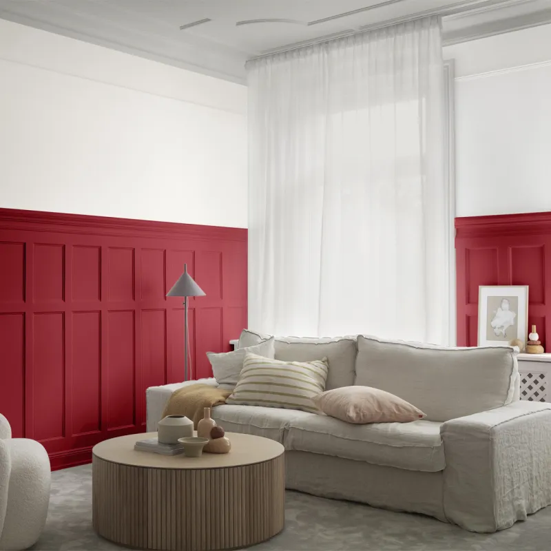 Galon är en djup och intensiv röd nyans med varma undertoner. Den tar verkligen för sig i ett rum och ger ett starkt och karaktärsfullt intryck. Galon trivs särskilt bra med varma toner av brunt, dämpade gröna och varma nyanser av vitt och rosa.