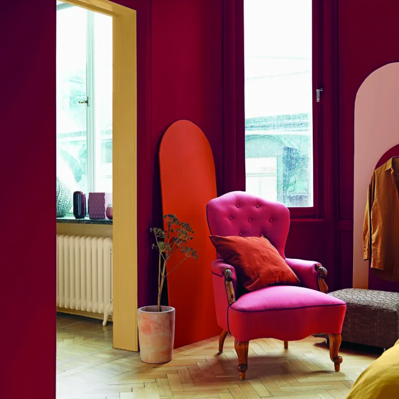 Här har vi Böna, en varm, mörk djupröd med hög intensitet. Den skapar en intim atmosfär och är fantastisk till varma toner av brunt eller till dämpade gröna och rosa nyanser. Också fin tillsammans med varmvit.