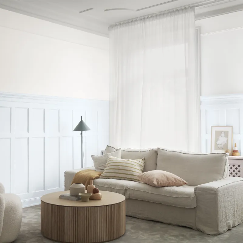 Moln är som en mild bris som smyger förbi på en klar himmel. Denna mycket ljust blå och bleka kulör ger rummet en känsla av öppenhet och ljus, vilket skapar en behaglig och fridfull stämning. Kombinera den gärna med andra ljusa och kalla nyanser.