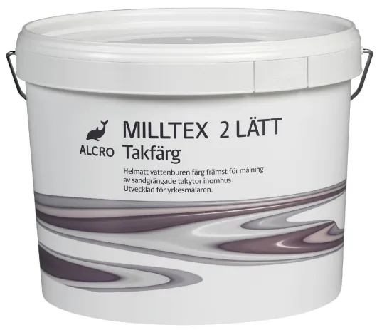 Milltex 2 Lätt Takfärg är en takfärg med låg densitet framför allt för målning av sandgrängade tak men du kan också använda den till tak av puts, betong och gipsskivor. Färgen är ergonomiskt anpassad för yrkesmålaren på så sätt att dess vikt är skonsam för armar och axlar.