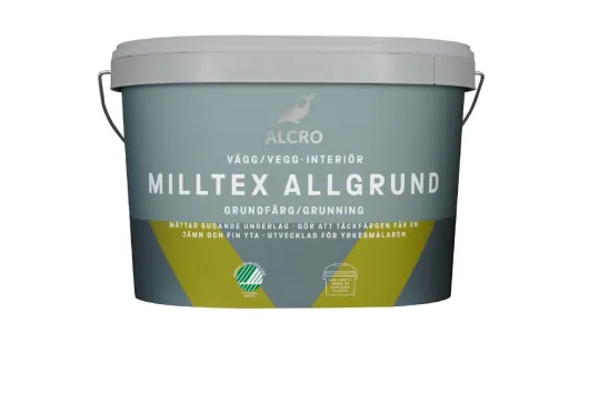 Milltex Allgrund Grundfärg är en färg för grundmålning av väggar och tak av puts, betong, gipsskivor, träfiberplattor, tapet och väv.* Den är fyllig och mättar sugande underlag så att täckfärgen får en jämn och fin yta. Färgen är särskilt utvecklad för yrkesmålaren. *För brandklass B-s1,d0 endast på ytor av klass A1 eller A2-s1,d0.
