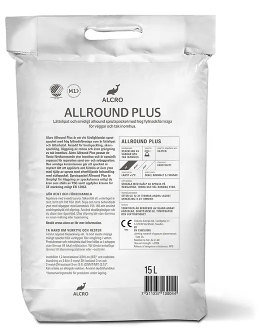 Sprutspackel Allround Plus är ett vitt färdigblandat sprutspackel lämpligt för ispackling, skarvspackling och bredspackling. Passar de flesta underlag vid nybyggnation och renovering. Sprutspackel Allround Plus är lämpligt för iläggning av spackelremsa enligt de krav som ställs i AMA 11, uppfyller kraven för CE-märkning enligt EN 13963-3A och är tillverkad i enlighet med ISO 9001 och ISO 14001.