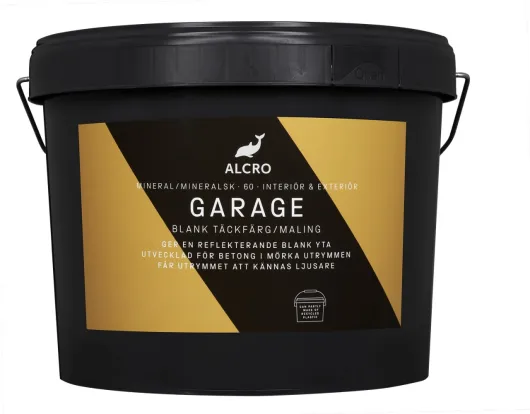 Garage Blank Täckfärg är en blank alkalibeständig akrylatfärg som skyddar underliggande betong mot fukt och karbonatisering. Garage lämpar sig speciellt för skydd av betongkonstruktioner som är utsatta för klimatpåfrestningar och är fri från skadlig sprickbildning som kan inverka på hållbarheten (större än hårfina sprickor). Användningsområden: För målning av betongytor i mörka utrymmen, t.ex parkeringshus både inom- och utomhus. Garage är CE-märkt.